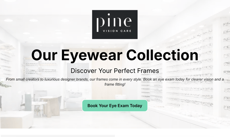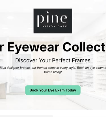 A clean, conversion-focused landing page built in GoHighLevel as a design and functionality sample, showcasing layout structure, platform capabilities, and product presentation for Pine Vision Care eyewear.